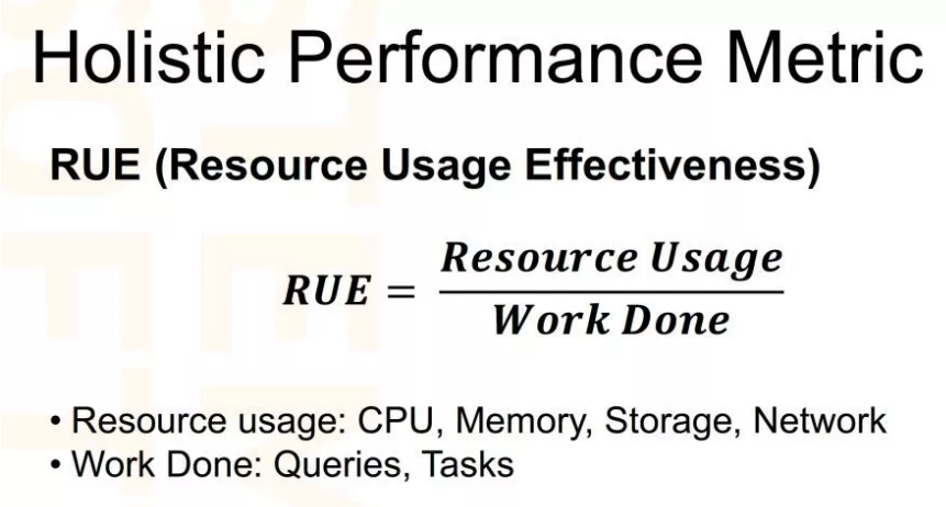 在 SPEED 平台里,我们也提出了一个全局性能指标,叫资源使用效率 RUE。基本思想很简单,就是衡量每个单位 Work Done 所消耗的资源。这里的 Work Done 可以是电商里完成的一个 Query,也可以是大数据处理里的一个 Task。而资源主要涵盖四大类:CPU、内存、存储和网络。通常我们会主要关注 CPU 或内存,因为目前这两部分消费了服务器大部分的成本。
