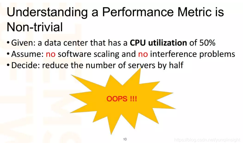 首先是性能指标。可能很多人都会说性能指标我每天都在用,这有什么好说的。其实,真正理解性能指标以及系统性能本身并不是那么容易。举个例子,在数据中心里最常用的一个性能指标是 CPU 利用率,给定一个场景,数据中心里每台机器平均 CPU 利用率是 50%,假定应用需求量不会再增长、并且软件之间也不会互相干扰,那么是否可以把数据中心的现有机器数量减半呢?
