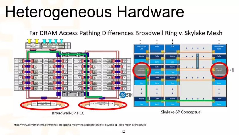 数据中心里的硬件异构性是性能分析的一大挑战,也是性能优化的一个方向。比如这里左边的 Broadwell 架构,是 Intel 过去几年服务器 CPU 的主流架构,近几年在推右边的 Skylake 架构,包含最新的 Cascade Lake CPU。Intel 在这两个架构上做了很大的改动,比如,Broadwell 下访问内存还是保持多年的环状方式,而到了 Skylake 改为网格状方式。