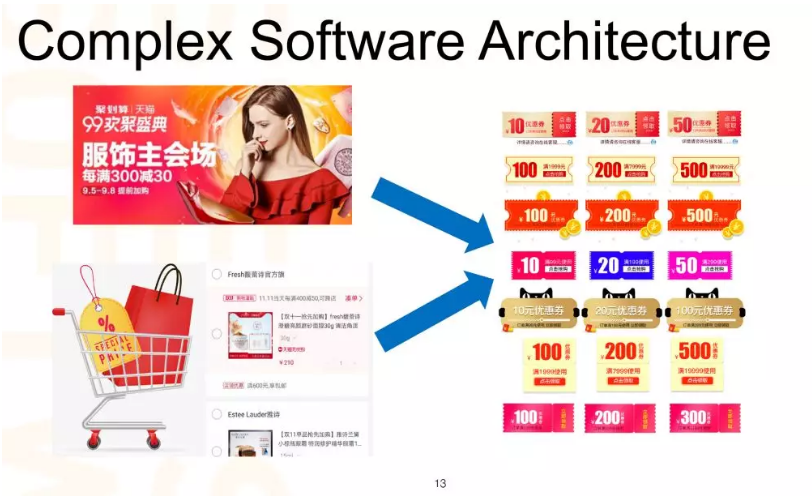 现代互联网服务的软件架构非常复杂,比如阿里的电商体系架构,而复杂的软件架构也是性能分析的一个主要挑战。举个简单的例子,图中右边是优惠券应用,左上角是大促主会场应用,左下角是购物车应用,这三个都是电商里常见的业务场景。从 Java 开发的角度,每个业务场景都是一个 application。电商客户既可以从大促主会场选择优惠券,也可以从购物车里选择优惠券,这是用户使用习惯的不同。