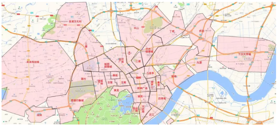 闲鱼app根据交通条件、商场分布情况、住宅区分布情况综合考虑,将城市划分为一个个商圈。杭州部分区域商圈划分如下图所示。