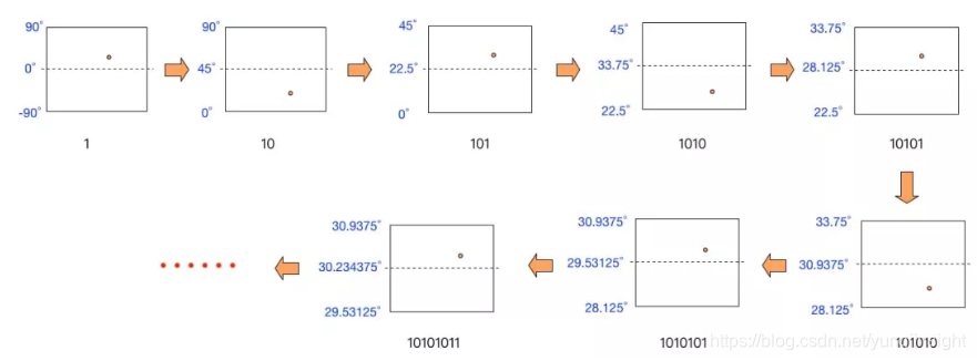 以坐标“30.280245, 120.027162”为例,计算其GeoHash字符串。首先对纬度做二进制编码:
