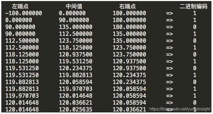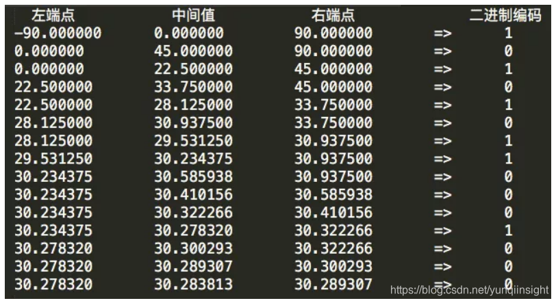 按照上面的流程,继续往下迭代,直到编码位数达到我们业务对精度的需求为止。完整的15位二进制编码迭代表格如下: