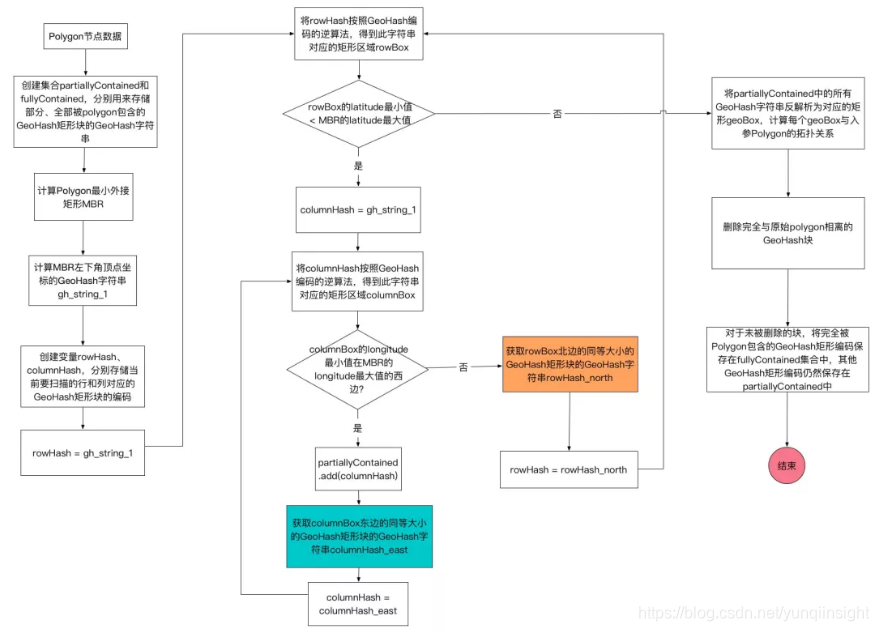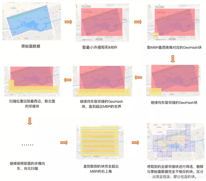 算法思路是,先找到目标Polygon的最小外接矩形MBR,计算此MBR西南角坐标对应的GeoHash编码。然后用GeoHash编码的逆算法,反解出此编码对应的矩形GeoHash块。以此GeoHash块为起点,循环往东、往北找相邻的同等大小的GeoHash块,直到找到的GeoHash块完全超出MBR的范围才停止。如此找到的多个GeoHash块,边缘上的部分可能与目标Polygon完全不相交,这部分块需要通过计算剔除掉,如此一来可以减少后续不必要的计算量。