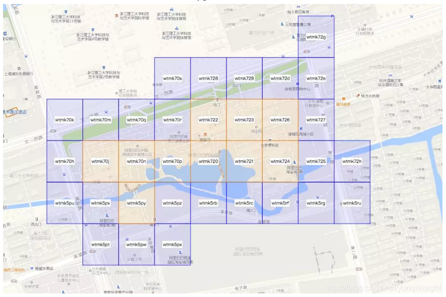 上面的例子中最终得到的结果高清大图如下,其中蓝色的GeoHash块是与原始Polygon部分相交的,橘黄色的GeoHash块是完全被包含在原始Polygon内部的。