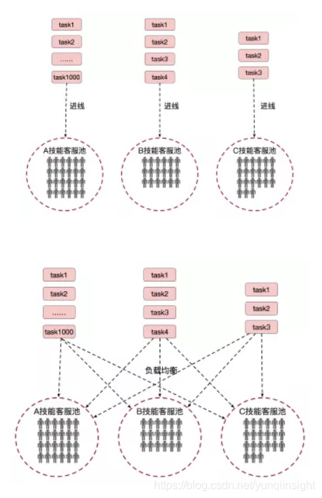 尽管预测式应急放班效果不错,但目前只针对云客服有效,对于SP类这种非选班类的客服怎么办?我们发现,线上排队时,往往是某几个技能组出现大量排队场景,比如商家线爆了,消费者线的客服可能处于空闲状态。如何解决这种忙闲不均问题?一个直观的极端想法就将所有的组变成一个大池子组,通过负载均衡分配让每一个客服都处于繁忙状态,从而达到效率最大化。而事实上并不是所有的技能组之间都能互相承接,这里既要权衡业务,又要线下培训让客服具备多技能。