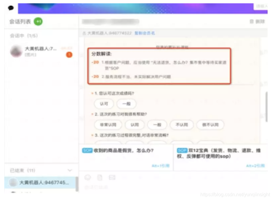 我们创新的提出了使用机器人(大黄)来培训客服这一全新的客服培训模式(已申请专利)。新客服在培训租户里,通过点击大黄头像,会产生一通非常真实的模拟会话,通过和会员聊天,不断学习平台工具使用,不断提升解决客户问题能力。一旦会话结束后,大黄机器人会对这通会话进行评价,并会告知应该使用某种具体的解决方案来回答用户问题。