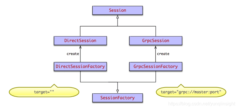 在后端master中,根据前端client调用tf.Session(target='', graph=None, config=None)时指定的target,来创建不同的Session。target为要连接的tf后端执行引擎,默认为空字符串。Session创建采用了抽象工厂模式,如果为空字符串,则创建本地DirectSession,如果以grpc://开头,则创建分布式GrpcSession。类图如下