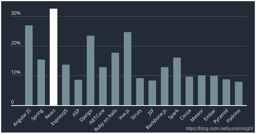2019年,开发者最想学洗的框架是React,Java系的Spring排名第七。