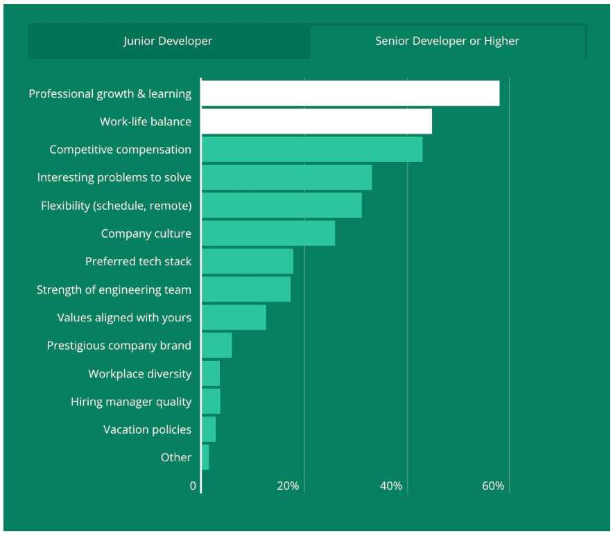 初级开发者和高级开发者找工作最看重的东西排名前三名是一致的:个人成长和学习空间、其次是工作与生活的平衡,也就是加班的多少、排名第三的是有竞争力的薪酬。