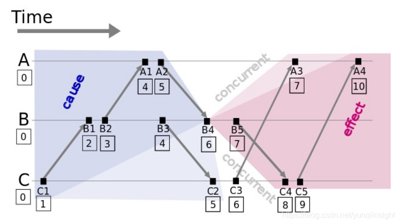 这样,所有关联的发送接收事件,我们都能保证发送事件的时间戳小于接收事件。如果两个事件之间没有关联,比如说A3和B5,他们的逻辑时间一样。正是由于他们没有关系,我们可以随意约定他们之间的发生顺序。比如说我们规定,当Lamport时间戳一样时,A进程的事件发生早于B进程早于C进程,这样我们可以得出A3 ‘happens before’ B5。而实际在物理世界中,明显B5是要早于A3发生的,但这都没有关系。