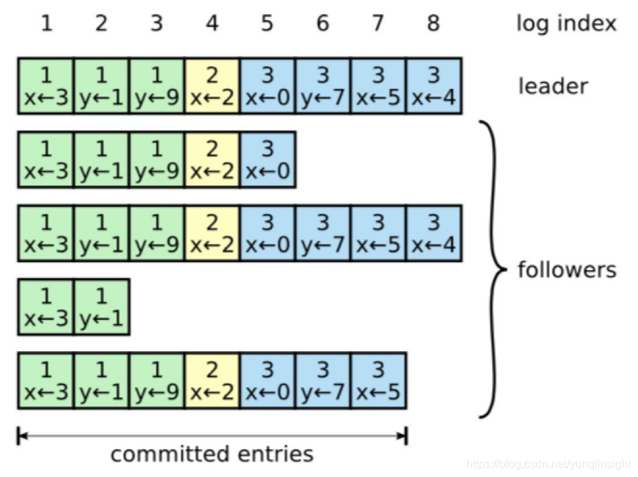 在Leader做写入时也是一个两阶段提交的过程。首先leader会把在自己的log中找到第一个空位index写入,并通过AppendEntries这个RPC把这个entry的值发给每个follower,如果收到半数以上的follower(包括自己)回复true,则再下一个AppendEntries中,leader会把committedIndex加1,代表写入的这个entry已经被提交。如在下图中,leader将x=4写入index=8的这个entry中,并把他发送给了所有follower,在收到第一台(自己),第三台,第五台(图中没有画index=8的entry,但因为这台服务器之前所有的entry都和leader保持了一致,因此它一定会投同意),那么leader就获得了多数票,再下一个rpc中,会将Committed index往前挪一位,代表index<=8的所有entry都已经提交。至于第二台和第四台服务器,log内容已经明显落后,这要么是因为前几次rpc没有成功。leader会无限重试直到这些follower和leader的日志追平。另外一个可能是这两台服务器重启过,处于恢复状态。那么这两台服务器在收到写入index=8的RPC时,follower也会把上一个entry的term和index发给他们。也就是说prevLogIndex=7,prevLogTerm=3这个信息会发给第二台服务器,那么对于第二台服务器,index=7的entry是空的,也就是log和leader不一致,他会返回一个false给leader,leader会不停地从后往前遍历,直到找到一个entry与第二台服务器一致的,从这个点开始重新把leader的log内容发送给该follower,即可完成恢复。raft协议保证了所有成员的replicated log中每个index位置,如果他们的term一致,内容也一定一致。如果不一致,leader一定会把这个index的内容改写成和leader一致。