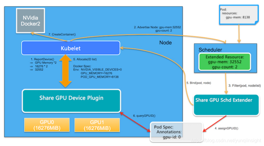 GPU Share Device Plugin利用nvml库查询到GPU卡的数量和每张GPU卡的显存, 通过ListAndWatch()将节点的GPU总显存(数量 显存)作为另外Extended Resource汇报给Kubelet; Kubelet进一步汇报给Kubernetes API Server。 举例说明,如果节点含有两块GPU卡,并且每块卡包含16276MiB,从用户的角度来看:该节点的GPU资源为16276 2 = 32552; 同时也会将节点上的GPU卡数量2作为另外一个Extended Resource上报。