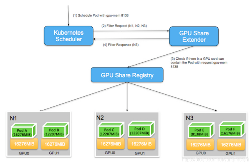 以下图为例, 在由3个包含两块GPU卡的节点组成的Kubernetes集群中,当用户申请gpu-mem=8138时,默认调度器会扫描所有节点,发现N1所剩的资源为 (16276 * 2 - 16276 -12207 = 4069 )不满足资源需求,N1节点被过滤掉。