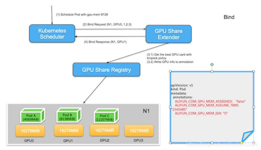 ALIYUN_COM_GPU_MEM_IDX保存到Pod的annotation中;同时也保存该Pod申请的GPU Memory作为ALIYUN_COM_GPU_MEM_POD和ALIYUN_COM_GPU_MEM_ASSUME_TIME保存至Pod的annotation中,并且在此时进行Pod和所选节点的绑定。