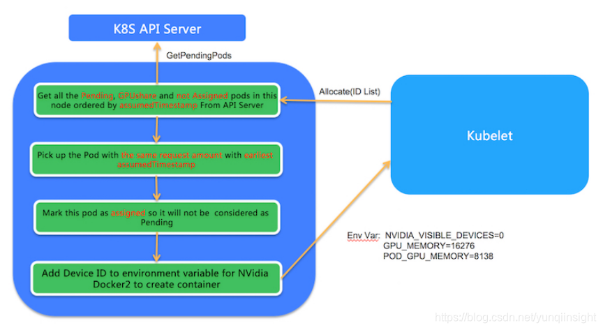 当Pod和节点绑定的事件被Kubelet接收到后,Kubelet就会在节点上创建真正的Pod实体,在这个过程中, Kubelet会调用GPU Share Device Plugin的Allocate方法, Allocate方法的参数是Pod申请的gpu-mem。而在Allocate方法中,会根据GPU Share Scheduler Extender的调度决策运行对应的Pod