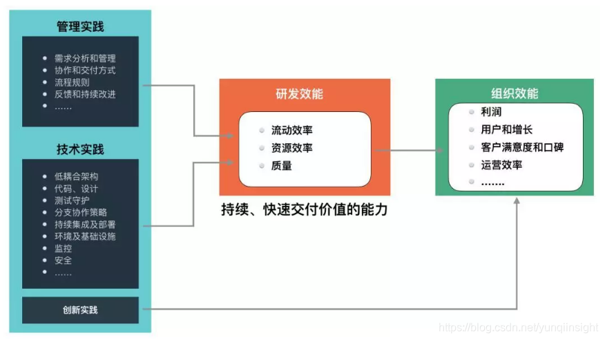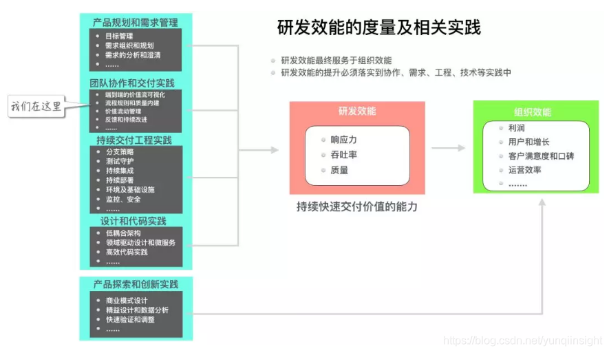如上图所示,研发效能最终为组织效能服务,必须体现到利润、增长、客户满意度等组织效能上;同时,研发效能的提升要落实到具体技术和管理的实践中,才可能发生。