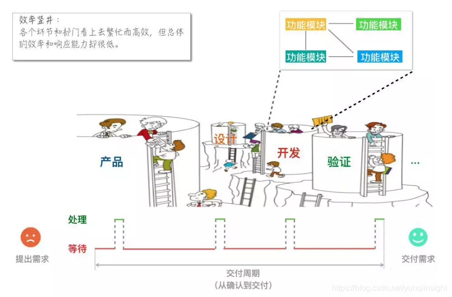 什么是效率竖井呢?上图描述了传统开发方式下,产品交付面临的普遍困境——各职能和部门局部优化带来一系列问题,如: