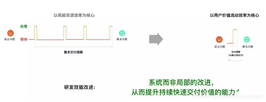 上图反映了效能改进的关键——从以局部资源效率为核心,转变为价值流动效率为核心的改进。