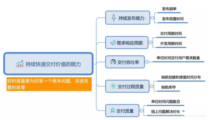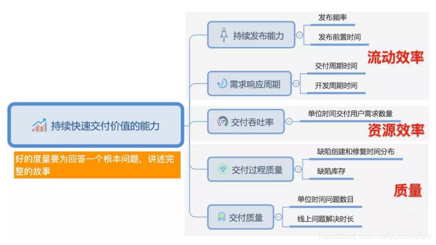 产品开发过程中会产生大量的数据,但数据不是度量。好的度量的标准是:它要为回答一个根本的问题讲述完整的故事。效能度量要回答的根本问题就是:一个组织“持续快速交付价值的能力”怎么样?