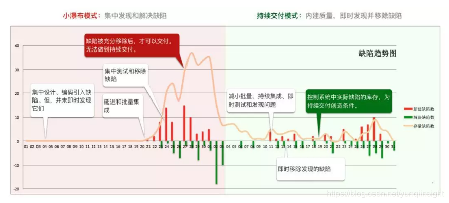 如上图所示,图形的横坐标是日期,横坐标上方红色竖条代表这一天发现缺陷数量;横坐标下方绿色竖条代表当天解决的缺陷数量;橙色曲线代表缺陷存量。图中左右两个部分比较了两种交付模式。