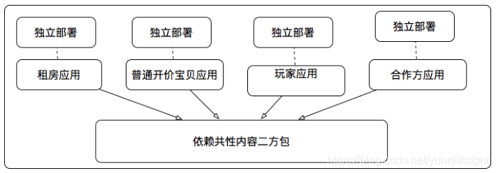 a. 将共性的内容打成二方依赖包,每个垂直业务依赖这个二方包,进行独立应用开发。