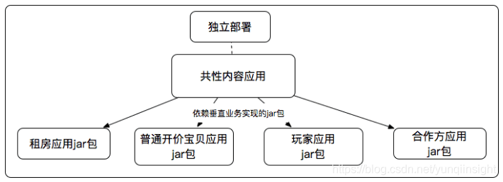 b. 垂直业务独立应用开发,然后将代码打成jar包,再集成到共性业务应用里,一起部署。