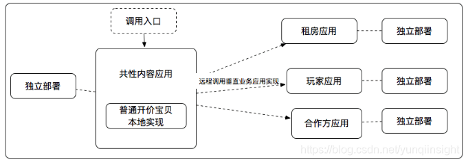 - 综合a和b的优点,将共性的业务独立部署,垂直业务既可以独立部署,也可以写在共性内容应用里。当调用某个垂直业务实现时,可以自动路由到具体的垂直业务实现(这个垂直业务实现可以是一个本地调用,也可以是一个远程调用)。这样,垂直业务的开发人员就可以在自己的应用中开发、部署、运维,解决开发人员的隔离问题。