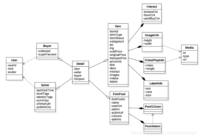 有了模型的设计,再转为类图设计。根据模型的抽象,详情页是信息展示的聚合,因此它是个聚合根,包含了商品、卖家、买家、鱼塘这些实体信息。 商品信息描述里,又有视频、图片、文本、互动等信息。视频、图片可以抽象为媒体信息。使用UML设计出最终的类图,如图13所示