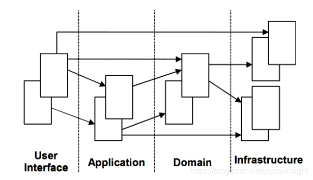 在实现详情页时,依据的是DDD中的定义。DDD中最主要的内容包括:entity、value object、aggregate、repository、factory和service (如图8所示), 以及Infrastructure, Domain, application和User Interface 分层结构,如图14所示: