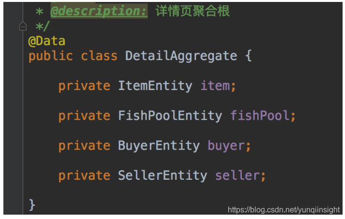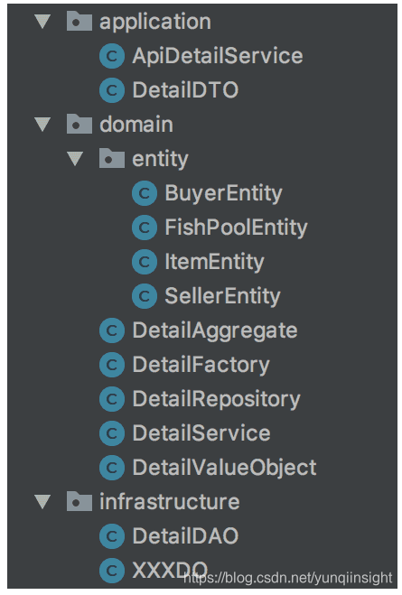 根据上文的模型抽象,领域对象主要有 ItemEntity, SellerEnity, BuyerEntity, FishPoolEntity,并通过详情页聚合根DetailAggregate聚合。