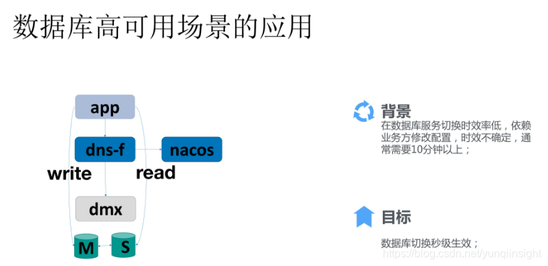 以数据库高可用的应用场景为例,我们的数据库切换效率比较低,依赖业务方修改配置,时效不确定,通常需要10分钟以上(备注:我们的数据库实际上已经实现了主备的功能,但当一个主服务出现问题的时候,总是要去切换IP。)切换IP的过程中,依赖运维和开发的协作,这是一个比较长的过程。