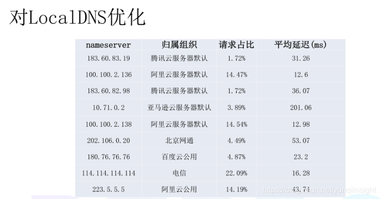 下面我们再着重分享下基于DNS-F对LocalDNS的优化。虎牙还没有去建设自己的LocalDNS,大部分使用的是一些公共的DNS,大致有以下这些组成。