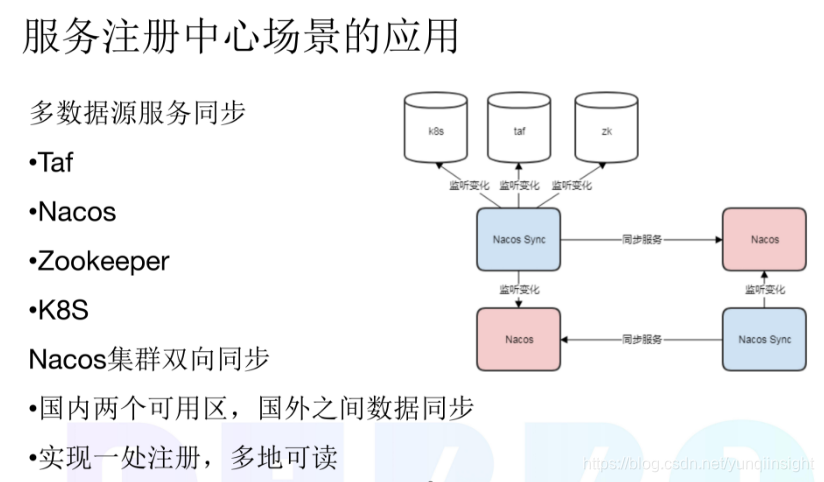 当然,Nacos不只是一个注册中心,它具备了融合多个数据中心的能力,支持多数据源的同步,例如,我们目前已经支持了Taf(虎牙内部的一个重要微服务体系)、Nacos自身、ZooKeeper、以及K8S上一些服务注册的同步。