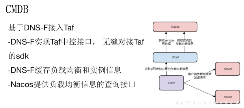 在实际的落地过程中,我们是在DNS-F接入Taf,在DNS-F上实现Taf的中控接口,无缝对接Taf的sdk。DNS-F提供缓存负载均衡和实例信息,Nacos则提供负载均衡信息的查询接口。