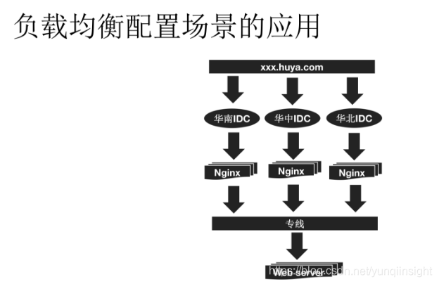 虎牙的域名(www.huya.com)会接入华南、华中、华北多个IDC机房,每个机房都会建设一个Nginx去做负载均衡,经过负载均衡的流量会通过专线返回到我们的后端服务器上。在这个过程中,如果我们去修改一个在中间的配置,需要下发到多个机房的上百个负责负载均衡的机器上,如果出现配置下发不及时,或下发配置失败,极大可能会出现故障,同时,负责均衡服务的机器对弹性能力的要求较高,在业务高峰如果不能快速扩容,容易出现全网故障。