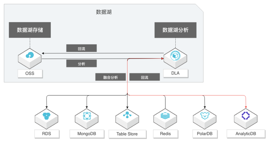 DLA作为数据湖数据分析场景中的中枢,能够对云上众多数据存储、数据库等系统进行融合数据分析,为用户提供统一操作视角,打通系统边界,对分析结果进行回流。
