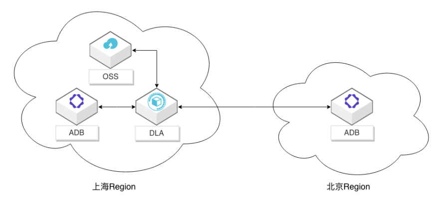 本文重点介绍通过DLA实现跨地域、跨实例的多AnalyticDB读写访问。涉及的网络结构如下图所示,假设用户使用的DLA服务位于上海region。