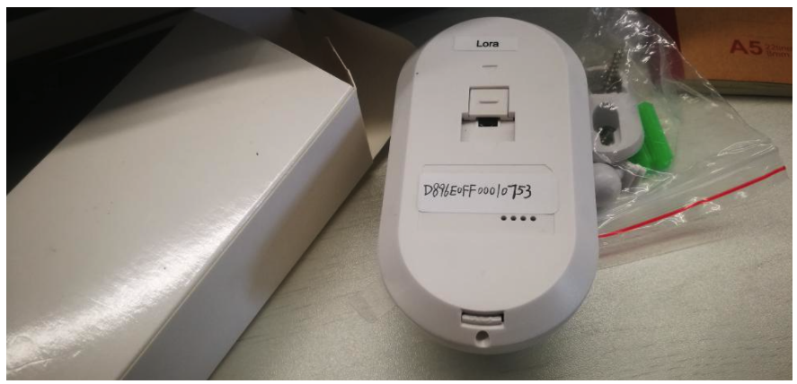 从网上购买来的认证过的LoRa传感器,拆出来的时候可以看到后面附了一个16位码的贴纸。这个是节点的DevEUI,在后面的新版硬件中还会加上6位的PINCODE字段。