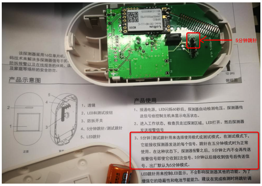 按照说明书,默认是5分钟模式——即收到一次警报之后5分钟之内不会再上传。这跟厕所的使用场景不一致,我们需要调成测试模式——即每次收到警报都会上传。把背部的壳子掰开(不需要螺丝刀)之后,调整跳针针帽位置到ON。
