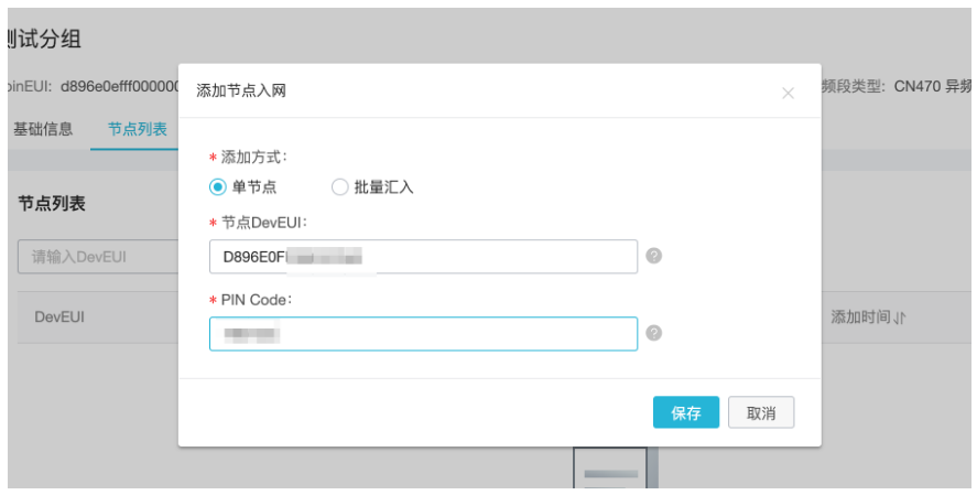 然后在弹窗内输入传感器节点上贴纸的信息。(注:作者的传感器为早期版本,只有DevEUI,PINCODE是自己拿的。目前市面的传感器都有贴上DevEUI和PINCODE信息,如果没有请联系供应商。)