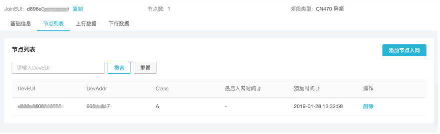 添加成功。这样就成功把一个传感器ID授权加入LinkWAN上了。接下来需要前往物联网平台进行节点上云。