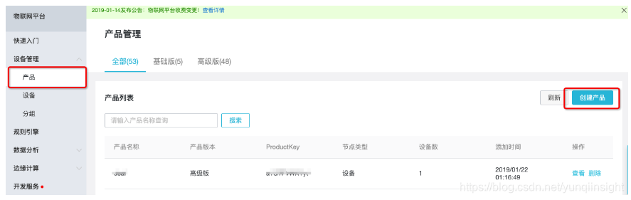 首先进入物联网平台Link Platform的产品页面。选择新建产品。产品相当于一个类(class),是某一类设备的集合,该类设备具有相同的功能,您可以根据产品批量管理对应设备。