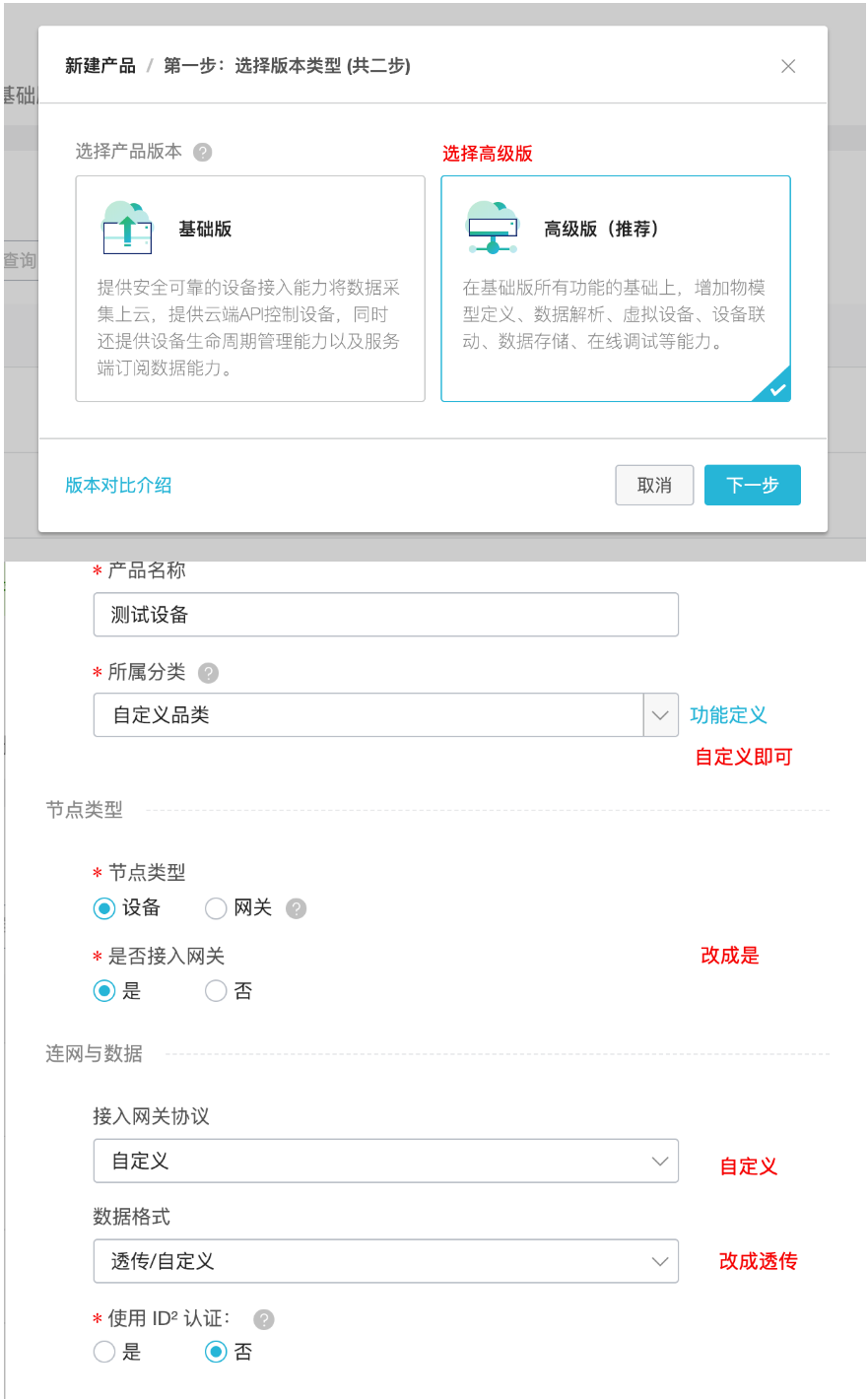 新建产品时,要选择透传。