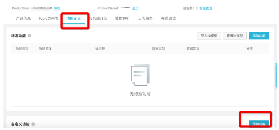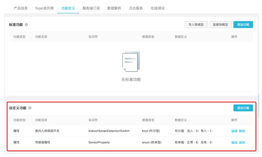对这个传感器,“020100”中的第一个BYTE“02”表示协议,“01”对红外传感器表示“有人”,“00”表示传感器状态正常。我们首先需要在产品里定义“有人经过”和“传感器状态”两个功能,用于记录这两个属性。前往产品详情页的“功能定义”tab,点击右下方“自定义功能”的“添加功能”。