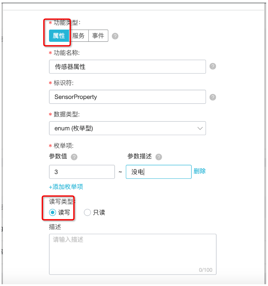 然后在弹窗内配置属性,“室内人体探测开关”配置为布尔型,“传感器属性”配置为枚举型。注意要是“读写型”。点击确定添加属性。