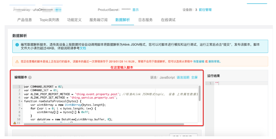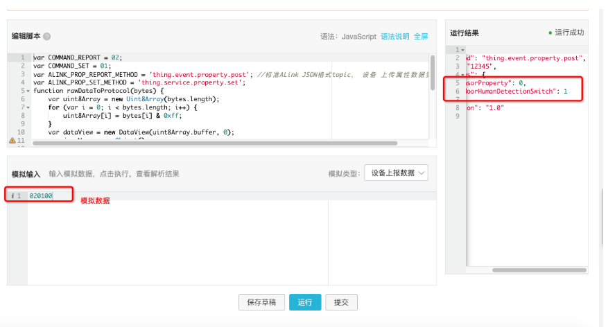 }然后点击“保存草稿”。之后输入我们的原始数据“020100”进行调试。可以看到右边解析成功了。这时候点击“运行”即可让脚本生效。
