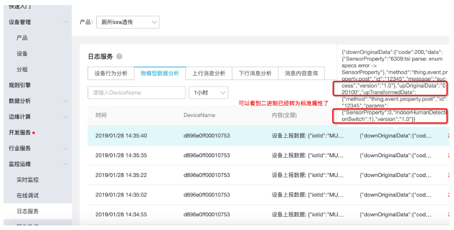 在日志里可以看到二进制的020100已经转为{"SensorProperty":0,"IndoorHumanDetectionSwitch":1}了。这样就完成了设备接入。
