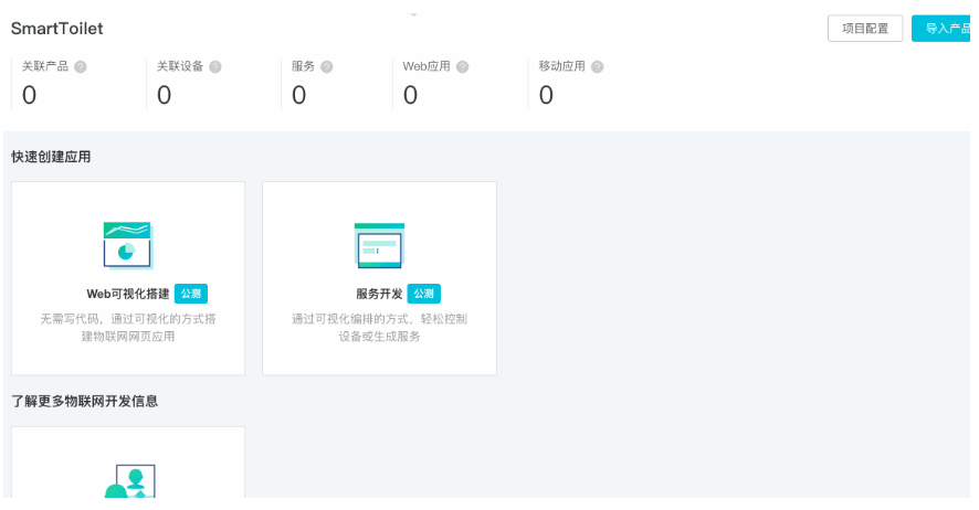 创建项目之后可以看到右边栏多了一项“SmartToilet”,点击查看进入项目详情。然后在项目概览页点击右上角导入产品,把刚才创建的产品导入到项目内。