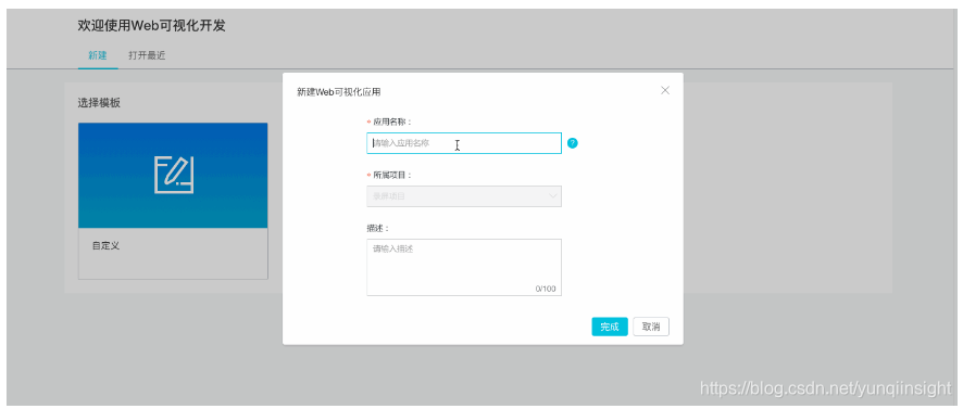然后在左侧栏点击“推荐”下的“Web可视化开发”,点击“新建应用”进入Web可视化开发工作台,然后选择空白模板进行新建。